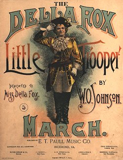 Interestingly enough, No.'s 2 and 3 appear to be the same piece. In the Library of Congress, there is a copy of "The Old Man's Story", printed in rust and green. The title is overprinted in bronze ink with " The Stranger's Story" printed in black over that. And though " The Della Fox Little Trooper March" is registered under the Richmond Music Co., it was printed by E.T. Paull Music Company, also of Richmond. Paull published only 15 months before he put his own name on the publishing business.